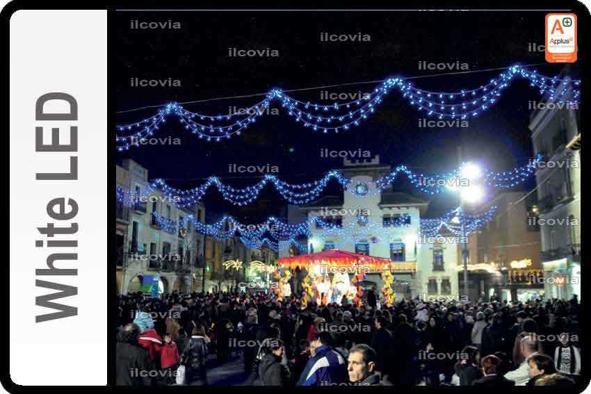 Il a été confectionné en couleur blanc froid qui sort des lampes du type LED placées en série le long de plusieurs guirlandes connectées en parallèle à une ramification principal