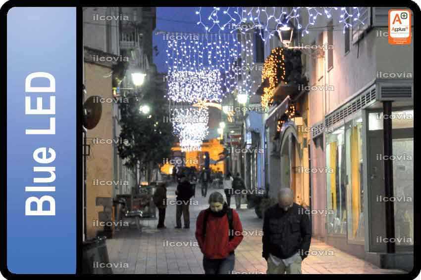 Produit en couleur bleu qui sort des lampes type LED distribuées tout le long de plusieurs sections de guirlandes de lumière branchées de façon parallèle sur la section principale
